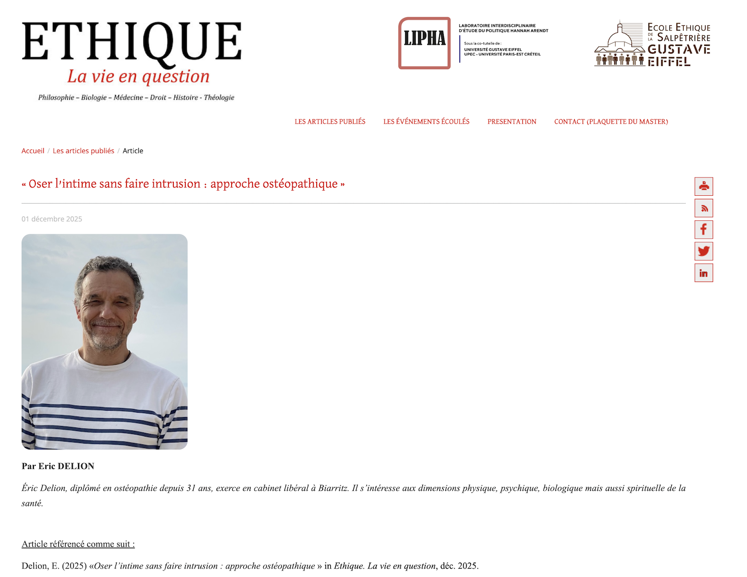 Mon article "Oser l'intime sans faire intrusion : approche ostéopathique" est paru dans la revue "Ethique, La vie en question" , vous pouvez y accéder en cliquant sur le lien suivant ci-dessous